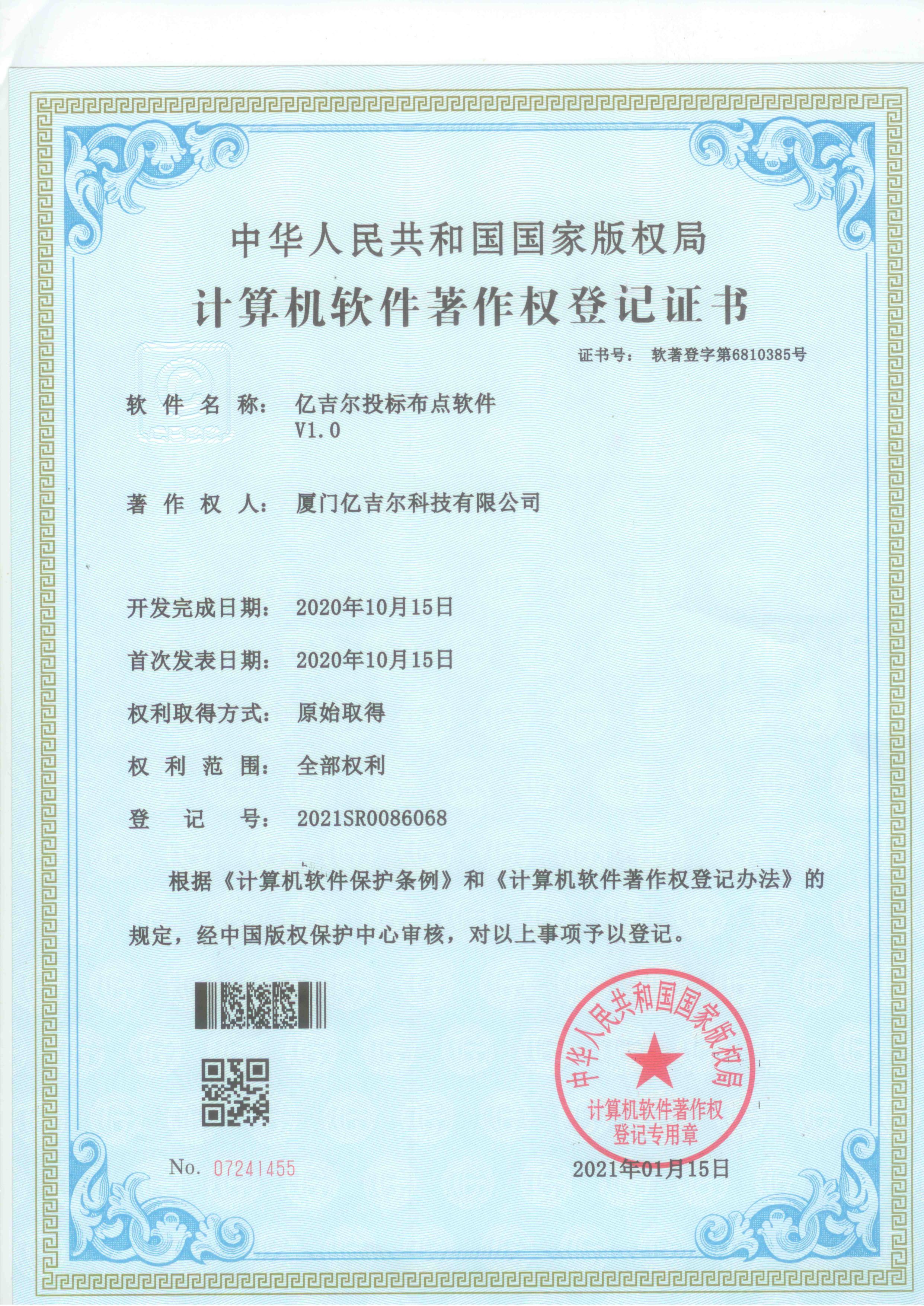 億吉爾投標布點(diǎn)軟件著(zhù)作權證書(shū) 發(fā)布日期:2023年11月22日 瀏覽次數:1718 關(guān)鍵字: 公司 1/1億吉爾投標布點(diǎn)軟件著(zhù)作權登記證書(shū)